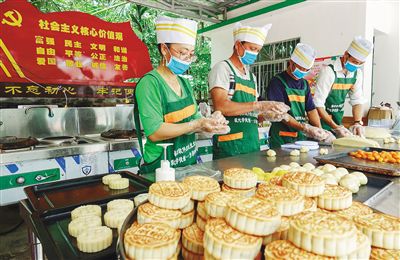 保亭黎族苗族自治县响水镇合口村村民在制作月饼。该村帮扶单位海南软件职业技术学院结合特色专业,为合口村制定《合口村乡厨培养计划》,第一期10名学员已全部取得职业资格证书。