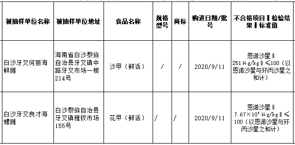 被抽检不合格的的分别是白沙牙叉何丽海鲜摊销售的沙甲(鲜活)和白沙牙叉良才海螺摊销售的花甲(鲜活),检验项目均为恩诺沙星不符合食品安全国家标准规定。