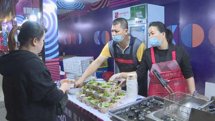 琼海融媒11月28日讯 (记者 邓玉婷 吴清珊) 今天上午开幕的琼海市消费扶贫集市暨特色小吃展活动余热未消,当天晚上,天刚擦黑,活动举办地的银海杂粮街80多个夜市摊位前就已顾客盈门,为琼海夜生活添彩。