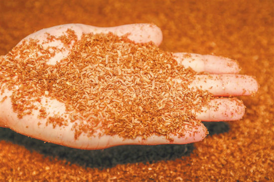 它们本身也是高质量的动物蛋白。“幼虫长为商品虫后,我们再根据市场需要选择烘干出售或化蛹育种。”鲁东梁介绍,经过烘干处理的黑水虻虫干粉,蛋白含量约为45%,近似或略高于鱼粉或肉骨粉。其榨出的油也可作为畜禽、水产类的开口饲料(供动物幼体开始摄食时的微型饲料)使用。