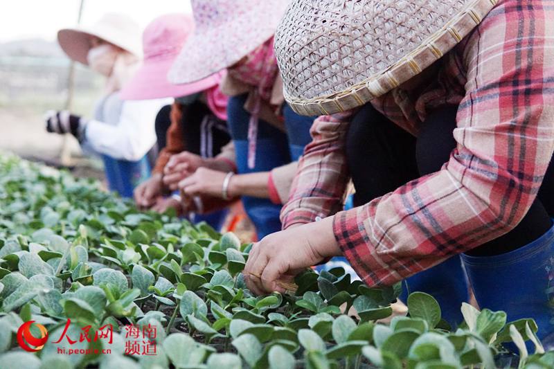 村民给青瓜苗进行嫁接(人民网海南频道 樊欢迪摄)