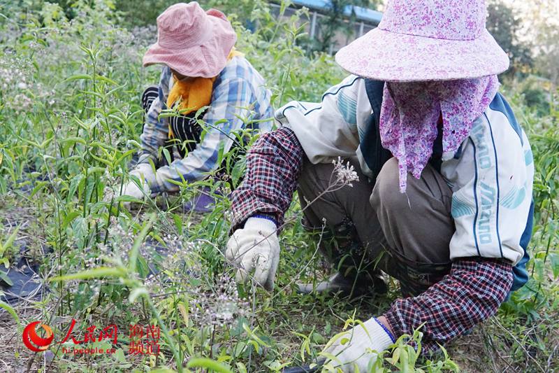村民们在忧遁草示范园内除草(人民网海南频道 樊欢迪摄)