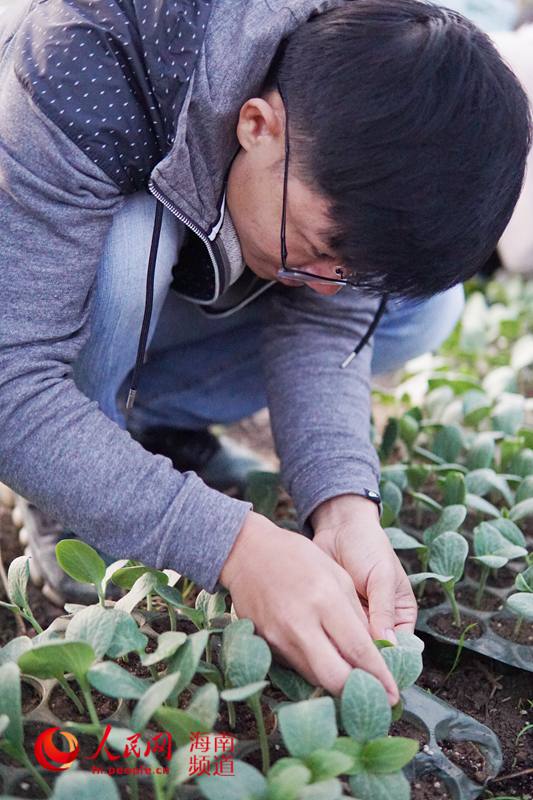 黄泽武查看青瓜苗生长情况(人民网海南频道 樊欢迪摄)