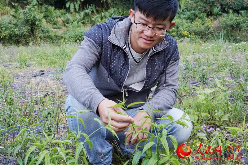 黄泽武查看忧遁草示范园中忧遁草生长情况(人民网海南频道 樊欢迪摄)