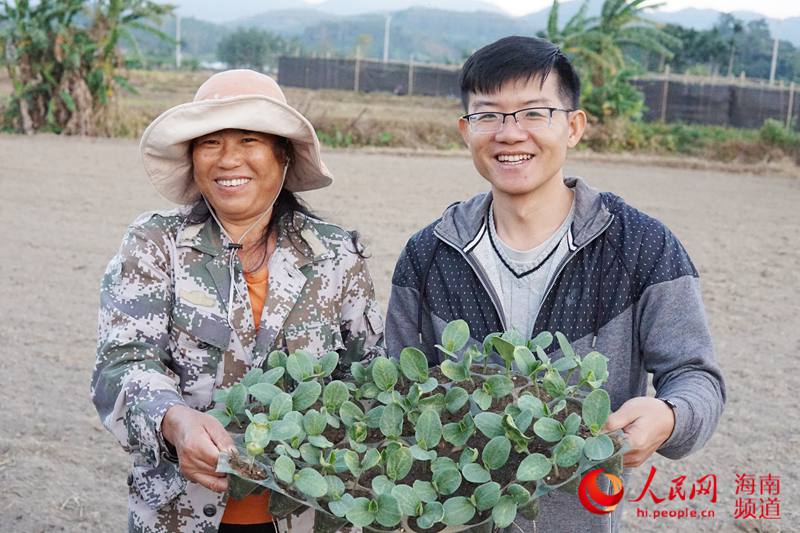黄泽武(右)和村民看着即将栽种的青瓜苗笑开颜(人民网海南频道 樊欢迪摄)