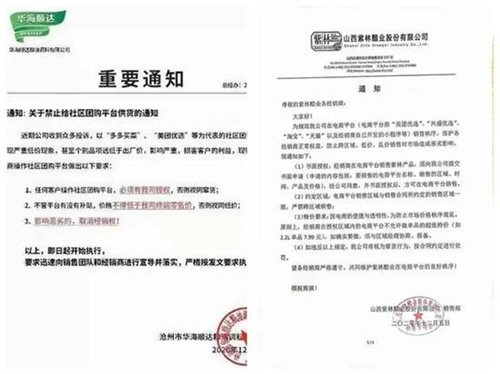 沧州市华海顺达粮油调料有限公司下发的通知显示:近期收到众多投诉,社区团购平台出现严重低价现象,甚至个别品项远低于出厂价,影响严重,损害客户的利益。“任何客户操作社区团购平台,必须有我司授权,否则视同窜货;不管平台有没有补贴,价格不得低于我司终端零售价。”