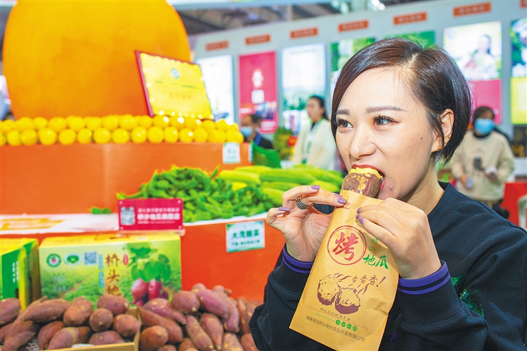 ② 澄迈馆内,一名消费者在品尝烤桥头地瓜。