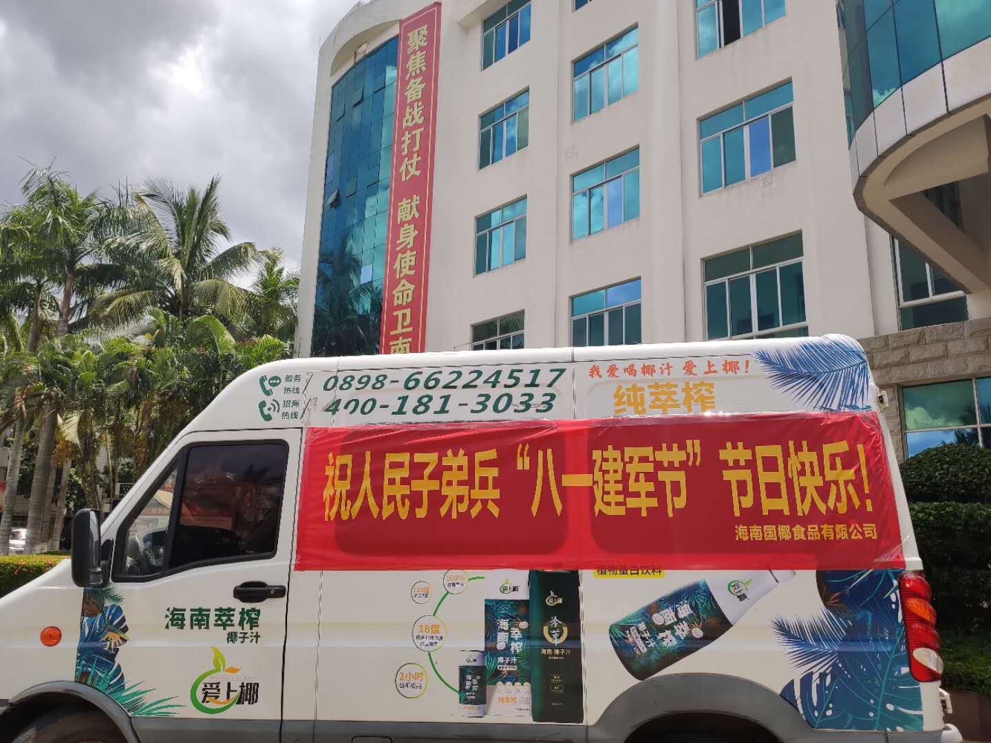海南国椰食品有限公司为部队官兵赠送一批绿色原味、健康营养无添加的“爱上椰”牌椰子汁,尽企业绵薄之力对部队官兵致以八一建军节节日的问候,同时祝愿我们的国家繁荣昌盛,国泰民安!